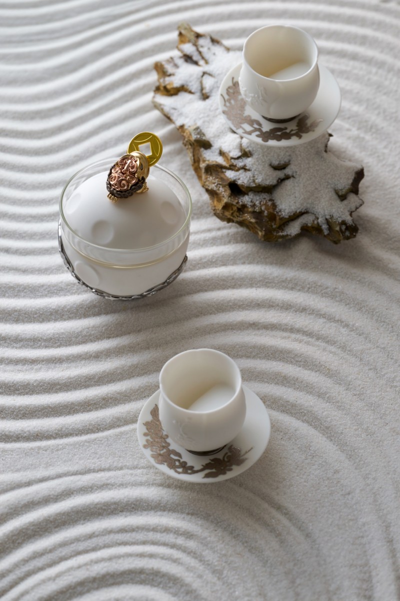 茶具的核心設計圍繞“月”展開:當茶湯注入白瓷杯時,杯內會依次顯現“新月→峨眉月→上弦月→盈凸月→滿月”的動態變化,既呼應了中秋“月滿人和”的核心意象,也讓“圓滿”的祈愿從抽象變為具象。在品茗時,能直觀感受到中秋的時序之美,讓日常使用也充滿節日儀式感。