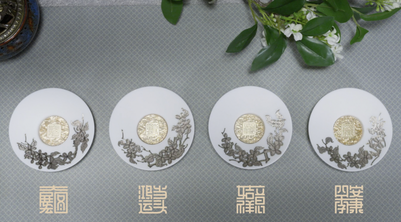 公道杯頂部的金蟾造型更是點睛之筆。作為“月宮三吉”之一,金蟾承載著“金蟾獻瑞、財源廣進”的傳統祝福,其口銜的磁吸式錢幣可取下把玩,增添互動趣味;茶杯杯身浮雕的桂花、杯碟的桂枝與金蟾呼應,暗合“蟾宮折桂”的美好寓意,有“事業順遂、前程錦繡”的現代內涵,適配商務饋贈與親友禮贈的情感需求。此外,杯碟底部刻印的“大展宏圖”“鴻運當頭”“吉祥如意”“四季安康”四組合體字,以傳統文字藝術傳遞多重祝福,讓禮盒的文化底蘊更顯厚重。