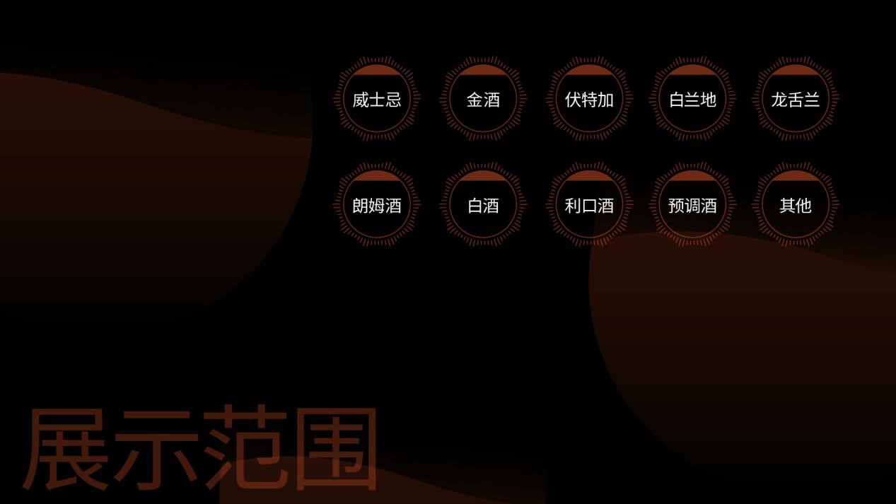 展示范圍:威士忌、金酒、伏特加、白蘭地、利口酒、龍舌蘭、朗姆酒、白酒、利口酒、預(yù)調(diào)酒、其他