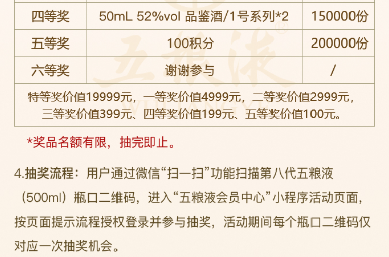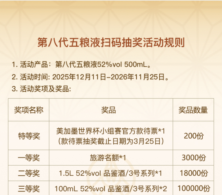 12月11日,五糧液官方發(fā)布第八代五糧液最新促銷政策。即日起至2026年11月25日,消費者購買八代五糧液開瓶掃描瓶脖處二維碼,即有機會獲得美加墨世界杯小組賽官方款待票(款待票抽獎截止日期為3月25日)、旅游名額、52%vol品鑒酒等獎品。