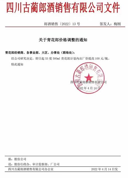 經(jīng)公司研究決定,即日起 53度500ml青花郎計(jì)劃內(nèi)出廠價(jià)提高100元/瓶。特此通知