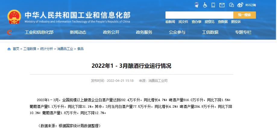 消費品工業司:2022年1-3月規上釀酒企業白酒產量達到202.4萬千升,同比增長4.7%