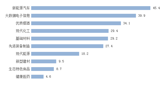 其中,現代能源總產值為908.18億元、優質煙酒總產值為555.19億元、大數據電子信息總產值為483.60億元、基礎材料總產值為466.50億元、現代化工總產值為415.67億元、生態特色食品總產值為400.54億元、先進裝備制造總產值為391.73億元、新型建材總產值為383.63億元、健康醫藥總產值為251.46億元、新能源汽車總產值為184.08億元。