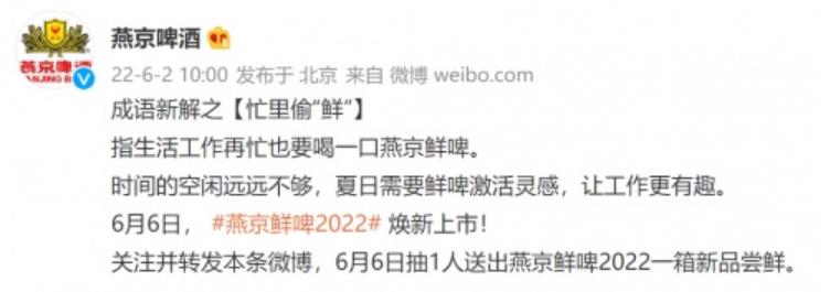 6月2日,燕京啤酒官方微博先后發布2張海報,其中預告了“6月6日燕京鮮啤2022煥新上市”。據酒展網分析,本次燕京啤酒鮮啤換新上市,在于鞏固老的消費用戶的基礎上,滿足新的年輕消費群體對于鮮啤的個性化、多樣性的需求。