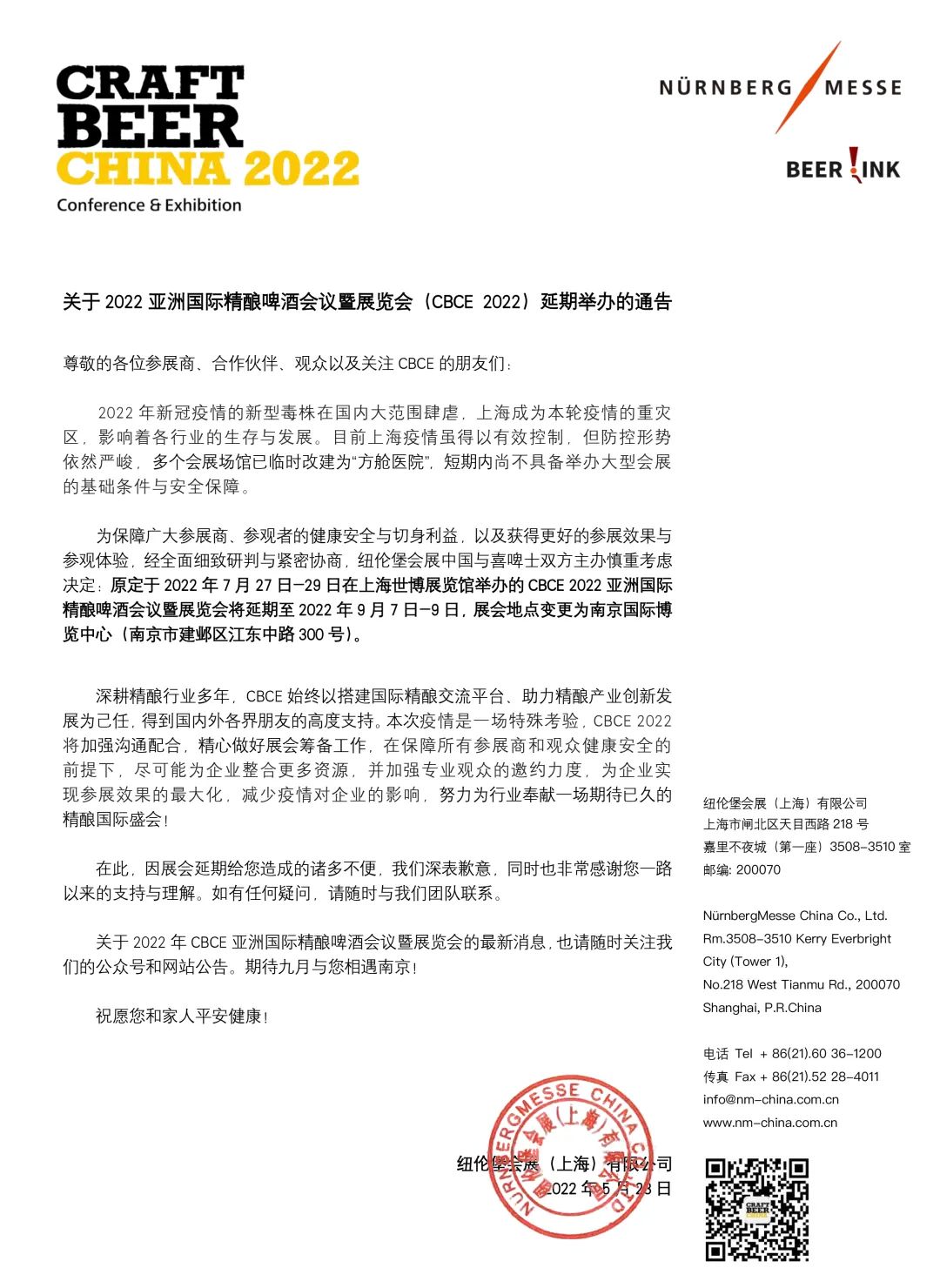 為保障廣大參展商、參觀者的健康安全與切身利益,以及獲得更好的參展效果與參觀體驗,經全面細致研判與緊密協商,紐倫堡會展中國與喜啤士雙方主辦慎重考慮決定:原定于2022年7月27日-29日在上海世博展覽館舉辦的CBCE 2022亞洲國際精釀啤酒會議暨展覽會將延期至2022年9月7日-9日,展會地點變更為南京國際博覽中心(南京市建鄴區江東中路300號)。