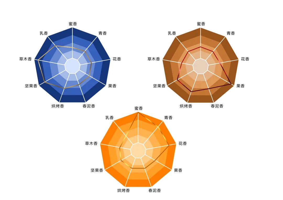 為了能讓消費者對馥郁香的豐富口感有更直觀的理解,中糧營養健康研究院繪制呈現出馥郁香“感官雷達圖”,首次將其應用在“三生萬物”產品上,以草木香、堅果香、烘烤香、春泥香、果香、花香、青香、蜜香、乳香等9大主要香氣組成9大維度,并通過二維圖形展示多維數據,精準呈現同一種香型三種風味的口感特質,更加科學立體地詮釋產品特性,給人耳目一新的體驗。