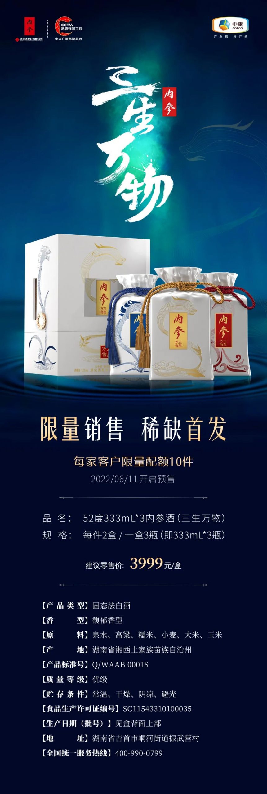 內參酒?三生萬物自6月11日開始發售,已面向全國合作伙伴開啟預售。每個客戶配額限10件,一件2盒,一盒3瓶,每瓶333mL。產品零售指導價3999元/盒。