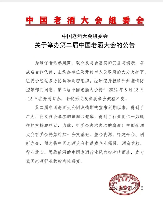 6月17日上午,中國老酒大會組委會發布《關于舉辦第二屆中國老酒大會的公告》。公告說,為確保老酒參展商、觀眾及與會嘉賓的安全與健康,在戰略合作伙伴、主承辦單位、支持單位及開封市人民政府的大力支持下,組委會經過多方協調和周密組織,經研究并報請開封疫情防控等部門同意,第二屆中國老酒大會將于2022年8月13日-15日在開封舉辦,會議形式及參展參會流程不變。