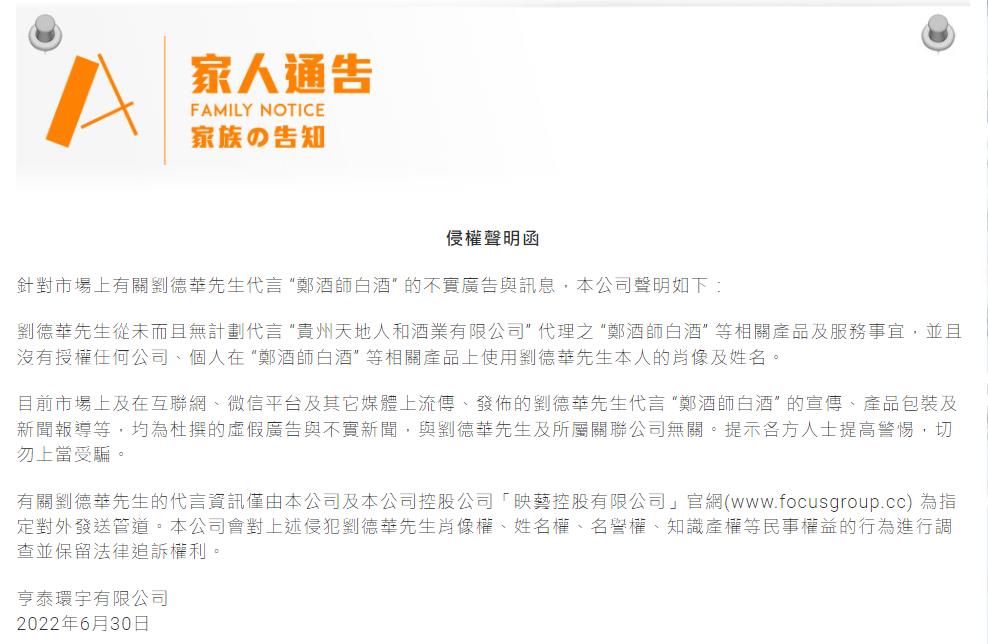 6月30日,劉德華官方粉絲平臺“華仔天地”發(fā)布侵權聲明函,針對市場上有關劉德華代言“鄭酒師白酒”的不實廣告與訊息予以澄清。