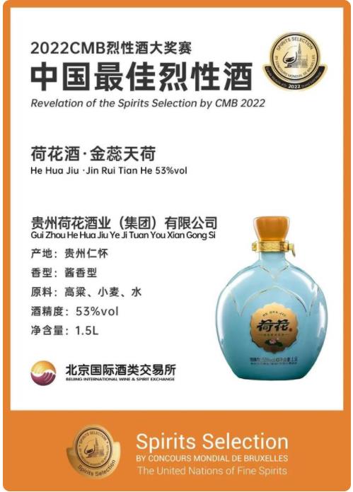 在來自34個國家和地區的120名國際評委層層嚴苛品評后,荷花酒·金蕊天荷與2021年53度飛天茅臺、第三代釣魚臺國賓酒、金六福·一見如故(熊貓版)等6款優秀酒水共摘全場最高獎項“大金獎”。隨后,按比賽慣例,賽事組委會對大金獎酒款進行二次品評,荷花酒·金蕊天荷憑借傳統大曲坤沙12987釀藝造就的經典醬香,榮膺“Revelation of the Spirits Selection by CMB”,拿下中國參賽烈性酒中的最高分,一舉摘得“中國最佳烈性酒”桂冠,此結果受比利時王國、歐盟雙重認證。