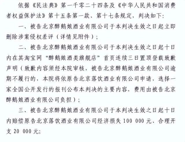 法院判定醉鵝娘公司需在判決生效之日起立即刪除涉案的侵權差評,并且要在判決生效之日起10日內在其淘寶網“醉鵝娘酒類旗艦店”首頁連續3日置頂登載對落飲公司的致歉聲明。