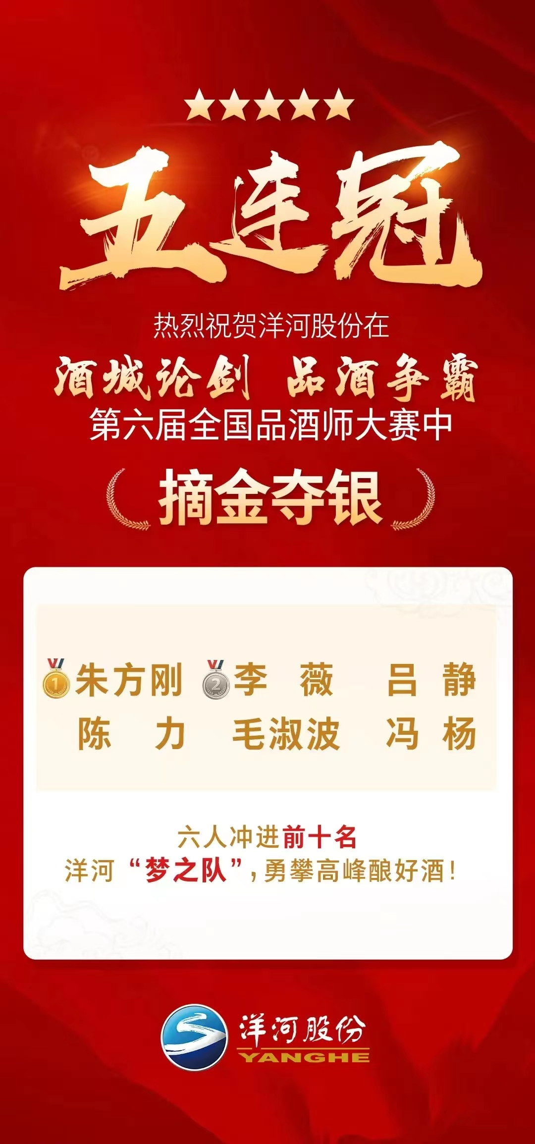洋河“夢之隊”白酒品評實力非凡,除第一屆全國品酒師大賽洋河未獲得冠軍外,此前的第二、三、四、五屆大賽中,洋河均摘得桂冠。在2021年第五屆全國品酒師大賽上,洋河取得了最為輝煌的戰績,來自全國白酒界172位頂尖品評技術人才,結果激烈的理論競賽、12輪品評技能比拼,洋河的田銳花、吳春梅、毛淑波等,包攬了第五屆全國品酒師大賽前十名。