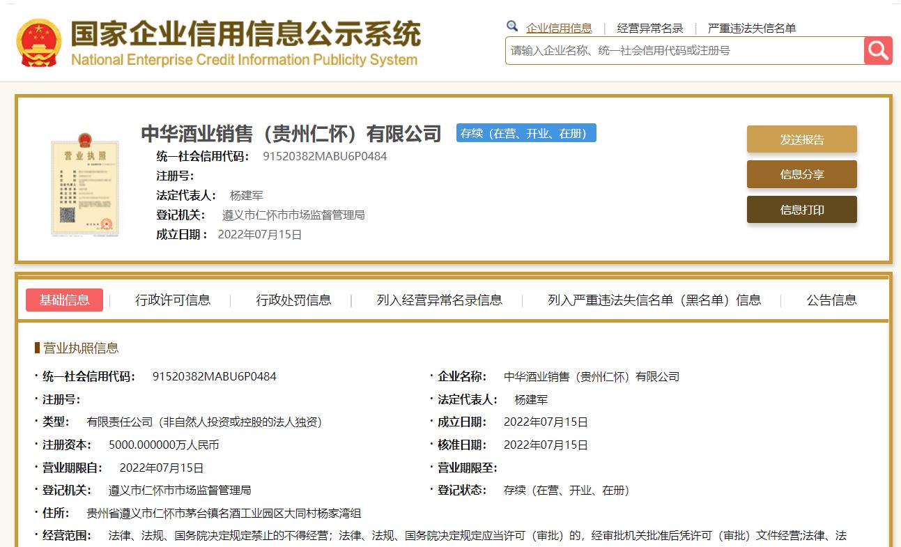 工商登記信息顯示,7月15日,北京首都酒業有限公司新增兩項對外投資,分別為中華酒業(貴州仁懷)有限公司和中華酒業銷售(貴州仁懷)有限公司,注冊資本分別為1000萬元和5000萬元,由首都酒業100%控股,法定代表人為楊建軍,注冊地點位于貴州省遵義市仁懷市茅臺鎮名酒工業園區。