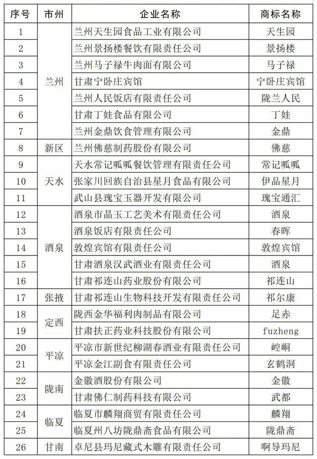 首批“甘肅老字號”完整名單如下: