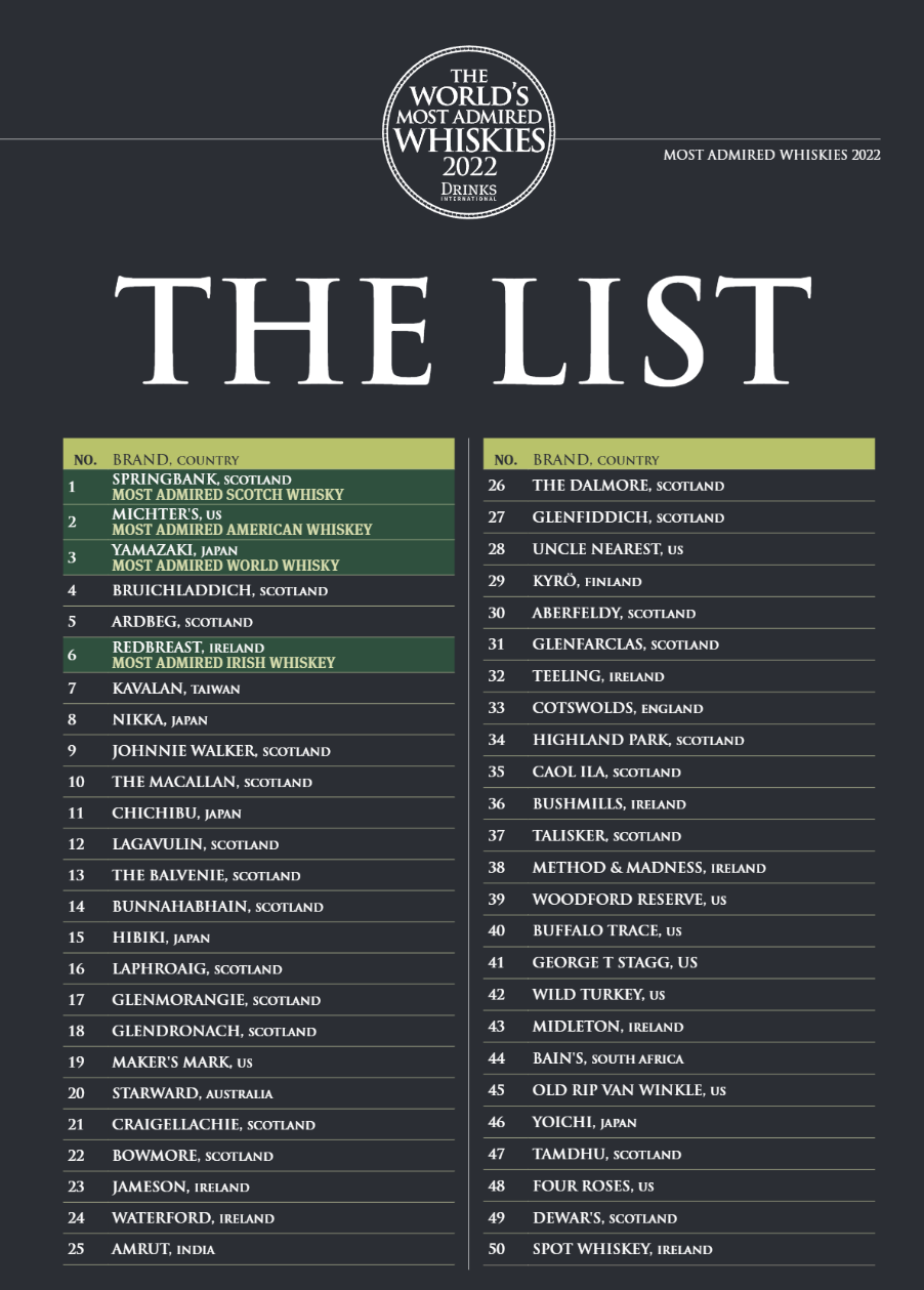 Drinks International 2022年全球最受歡迎威士忌品牌完整榜單: