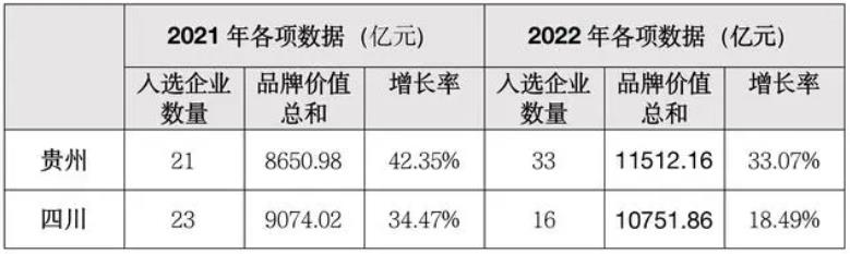 但隨著近幾年醬香酒的火爆,根據本屆華樽杯組委會評測,貴州以入選企業數量、品牌價值總和、增長率三項數據超過四川。四川省今年有16家企業入選,較去年少了7家企業。品牌價值從去年的9074.02億元增長到今年的10751.86億元,增幅為18.49%。今年貴州省共33家企業入選,品牌價值從去年的8650.98億元,大漲至11512.16億元,增幅為33.07%。