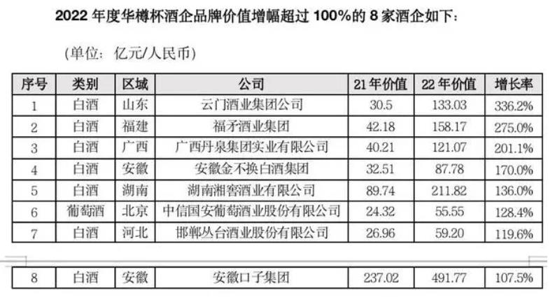 報告指出,今年的知名酒企品牌價值全面大幅上升,前200名的酒企品牌價值總和達到了61972.35億元,相較于去年的51245.95億元,增長率達到了21.2%。其中,品牌價值增幅超過100%的酒企有8家,增幅30%-80%的酒企18家,20%至29%的酒企54家。
