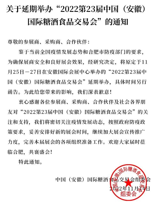 鑒于當前全國疫情發展態勢和合肥市防疫部門的要求,為確保展商安全和良好展會效果,經研究決定,將原定于11月25日-27日在安徽國際會展中心舉辦的“2022第23屆中國(安徽)國際糖酒食品交易會”延期舉辦,具體時間另行函告。為此給您帶來的影響,我們深表歉意!