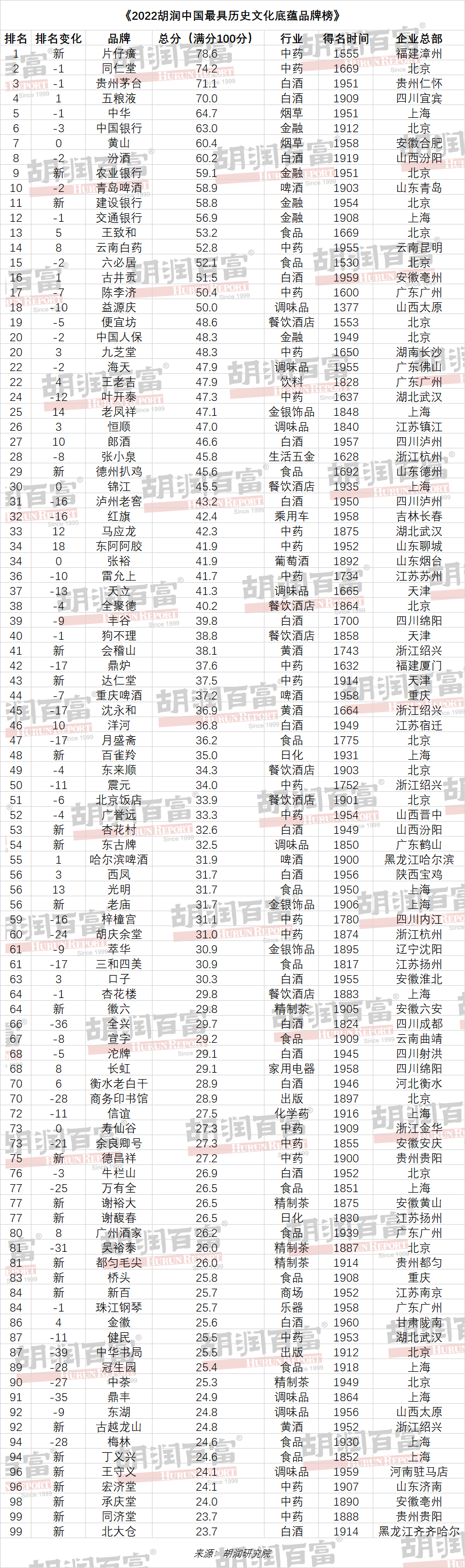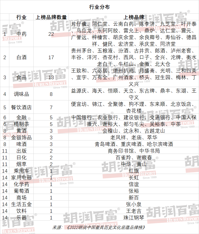 2022年12月14日,胡潤研究院發(fā)布《2022胡潤中國最具歷史文化底蘊品牌榜》(Hurun Most Successful Chinese Heritage Brands 2022),100個中國內(nèi)地最成功的60歲以上品牌上榜。這是胡潤研究院連續(xù)第三年發(fā)布該榜單。