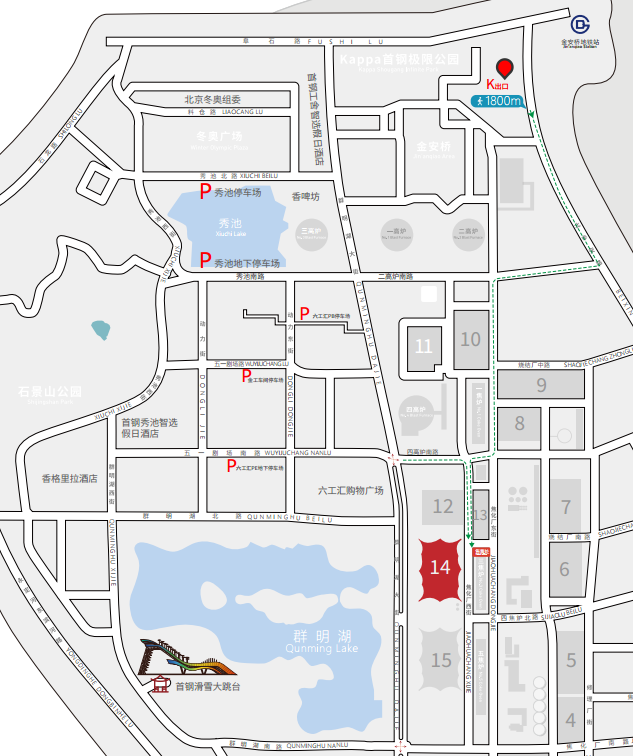 乘坐11號線至新首鋼地鐵站D口,步行到14號大棚
