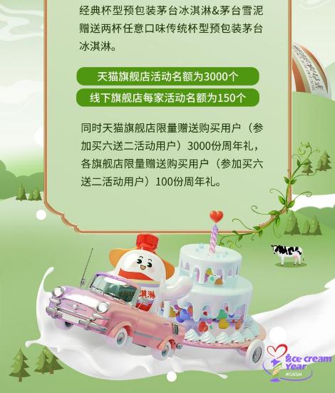5月29日至6月10日期間,消費者在茅臺冰淇淋線下旗艦店或天貓旗艦店,可享“買任意口味六杯經典杯型預包裝茅臺冰淇淋&茅臺雪泥,贈送兩杯任意口味傳統杯型預包裝茅臺冰淇淋”,天貓旗艦店活動名額為3000個,線下旗艦店每家活動名額為150個。同時天貓旗艦店限量贈送購買用戶(參加買六送二活動用戶)3000份周年禮,各旗艦店限量贈送購買用戶(參加買六送二活動用戶)100份周年禮。