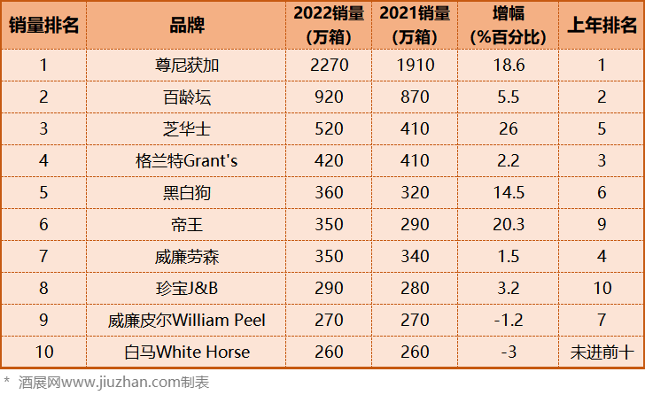 威士忌起源于蘇格蘭,蘇格蘭也出產了許多殿堂級的威士忌酒品,至今仍被威士忌擁躉們仰慕。那么2022財年,銷量前十的威士忌品牌是哪些,我們來盤點一下。