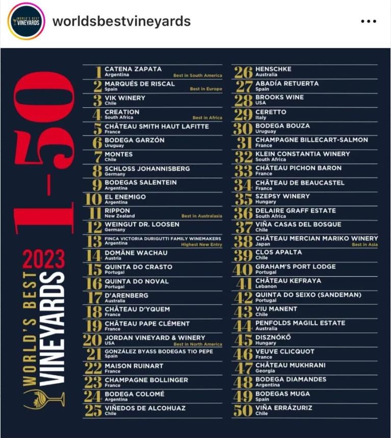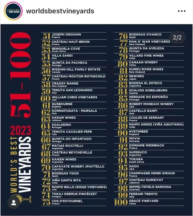 讓我們來看看2023“世界最佳葡萄園”百大獲獎名單: