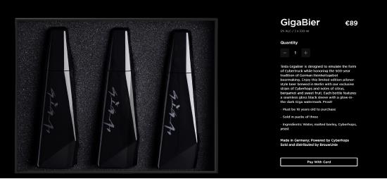 此前,特斯拉在歐洲市場推出一款皮爾斯納風(fēng)格啤酒 GigaBier,3瓶售價89歐元,這款酒330ml,酒精含量5%,屬于限量版產(chǎn)品,每人最多可訂購3瓶。