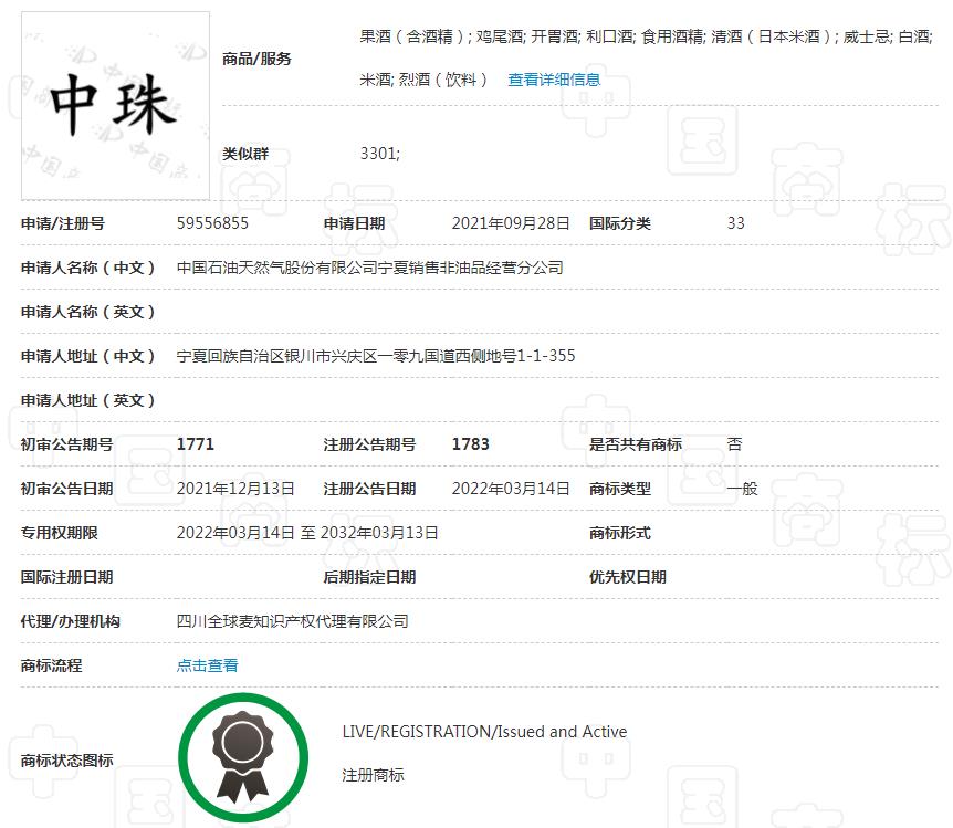 據了解,“中珠”品牌含義取自“中國葡萄酒,當驚世界殊”和被譽為“紫色珍珠”的賀蘭山東麓釀酒葡萄。查詢中國商標網顯示,33類“中珠”品牌隸屬于中國石油天然氣股份有限公司寧夏銷售非油品經營分公司。