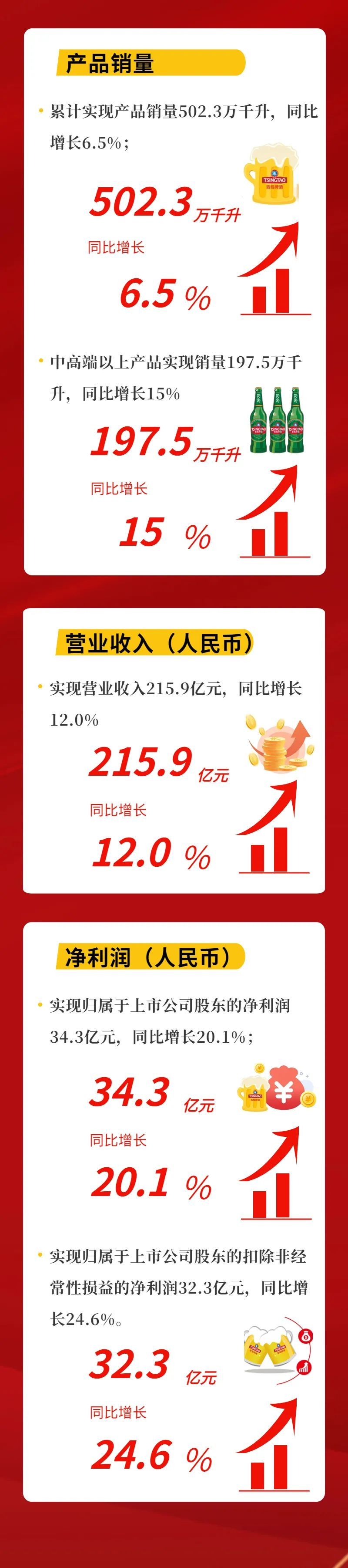 8月27日,青島啤酒發(fā)布2023年半年度報告。銷量營收凈利全面增長,高質量發(fā)展再創(chuàng)紀錄。實現(xiàn)產品銷量502.3萬千升,同比增長6.5%;中高端以上產品實現(xiàn)銷量197.5萬千升,同比增長15%。實現(xiàn)營業(yè)收入人民幣215.9億元,同比增長12.0%;實現(xiàn)歸屬于上市公司股東的凈利潤人民幣34.3億元,同比增長20.1%;實現(xiàn)歸屬于上市公司股東的扣除非經(jīng)常性損益的凈利潤32.3億元,同比增長24.6%。