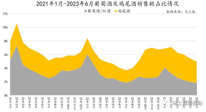 作為市場規模最大的白酒、啤酒,其整體銷售額占比的波動也是三個梯隊中最為顯著的,但二者相加基本保持在80%-90%的區間內。與此同時,第一梯隊內部的銷售額占比變動也相對較大,白酒與啤酒在2021年7-8月、2022年4-7月以及2023年1月受季節、節日等因素影響,均經歷了明顯的此消彼長。但就整體而言,白酒的市場份額略高于啤酒,二者的消費高峰期均會帶動第一梯隊總體市場份額的上漲。