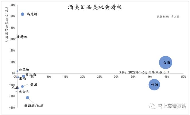 三個梯隊中,洋酒梯隊的銷售額占比雖然最小但其占比增速不容小覷。進一步觀察其內部占比數據可以發現,銷售額占比最高的白蘭地對該梯隊總體占比的變動影響較大;威士忌雖銷售額占比增速為負但仍有一定的市場份額;而伏特加目前的市場份額雖然微不足道,但可以期待其在30%的增速下有更加亮眼的市場成績。在此基礎上,洋酒梯隊總體銷售額占比呈現出提升趨勢,結合第二梯隊占比的下降趨勢來看,洋酒在中國市場中的提升空間值得期待。