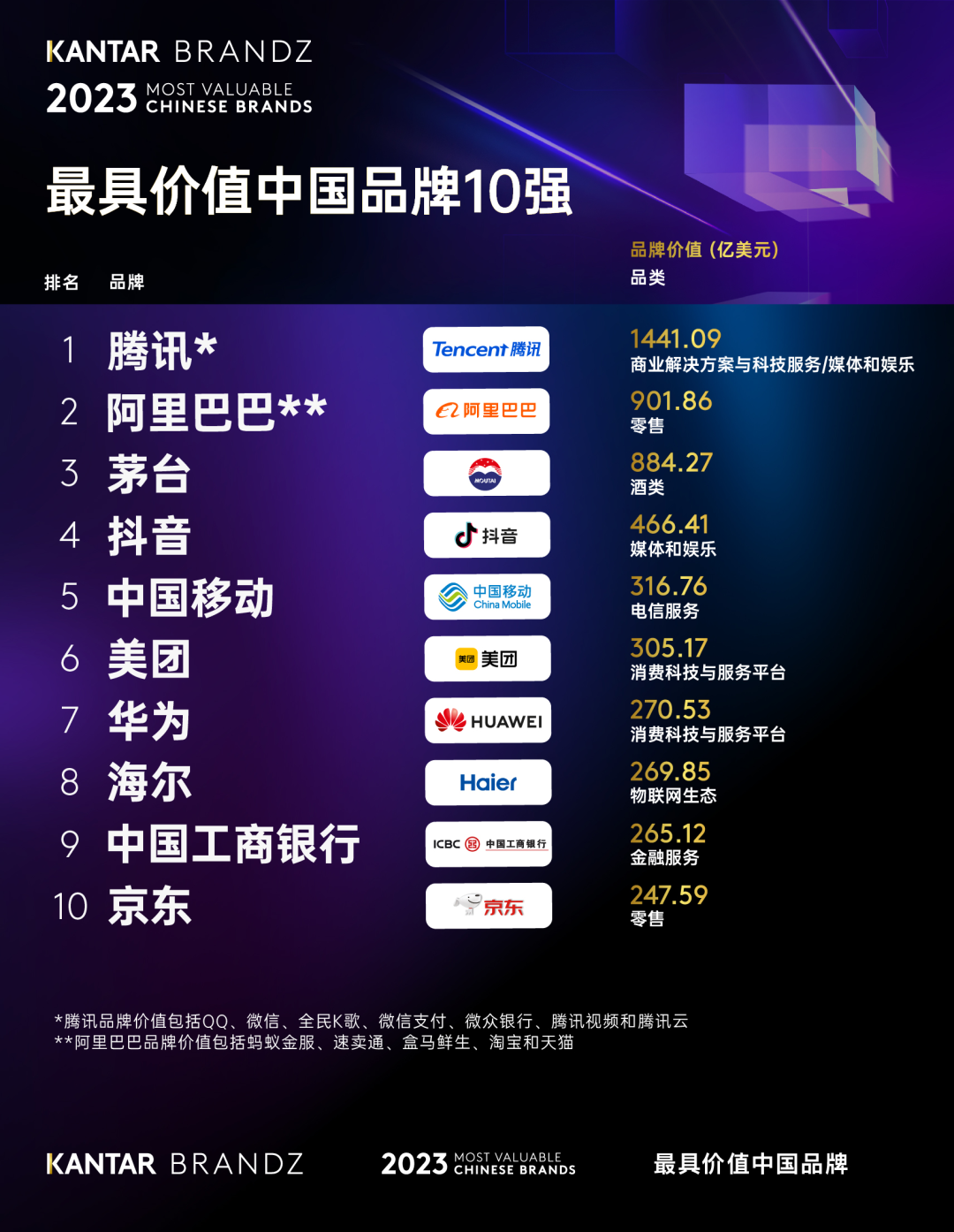 騰訊(1441.09億美元)連續第三年位居榜首,這主要得益于騰訊以“扎根消費互聯網、擁抱產業互聯網,推動可持續社會價值創新”作為公司發展的新底座,牽引所有核心業務,從而為用戶、為產業,最終為社會持續創造價值。阿里巴巴(第二名,901.86億美元)、茅臺(第三名,884.27 億美元)和抖音(第四名,466.41 億美元)穩步保持2022年的勢頭。中國移動(第五名,316.76 億美元)自2019年后首次沖入榜單前五,憑借其多元化的業務服務以及對5G、云服務等新技術基礎設施的投入,實現品牌價值38%的強勢增長。榜單中唯一的物聯網生態品牌海爾(第八名,269.85 億美元),聚焦智慧住居和產業互聯網兩大主賽道,持續與C端用戶和B端客戶共創新生態、新體驗、新價值,品牌排名穩步提升。