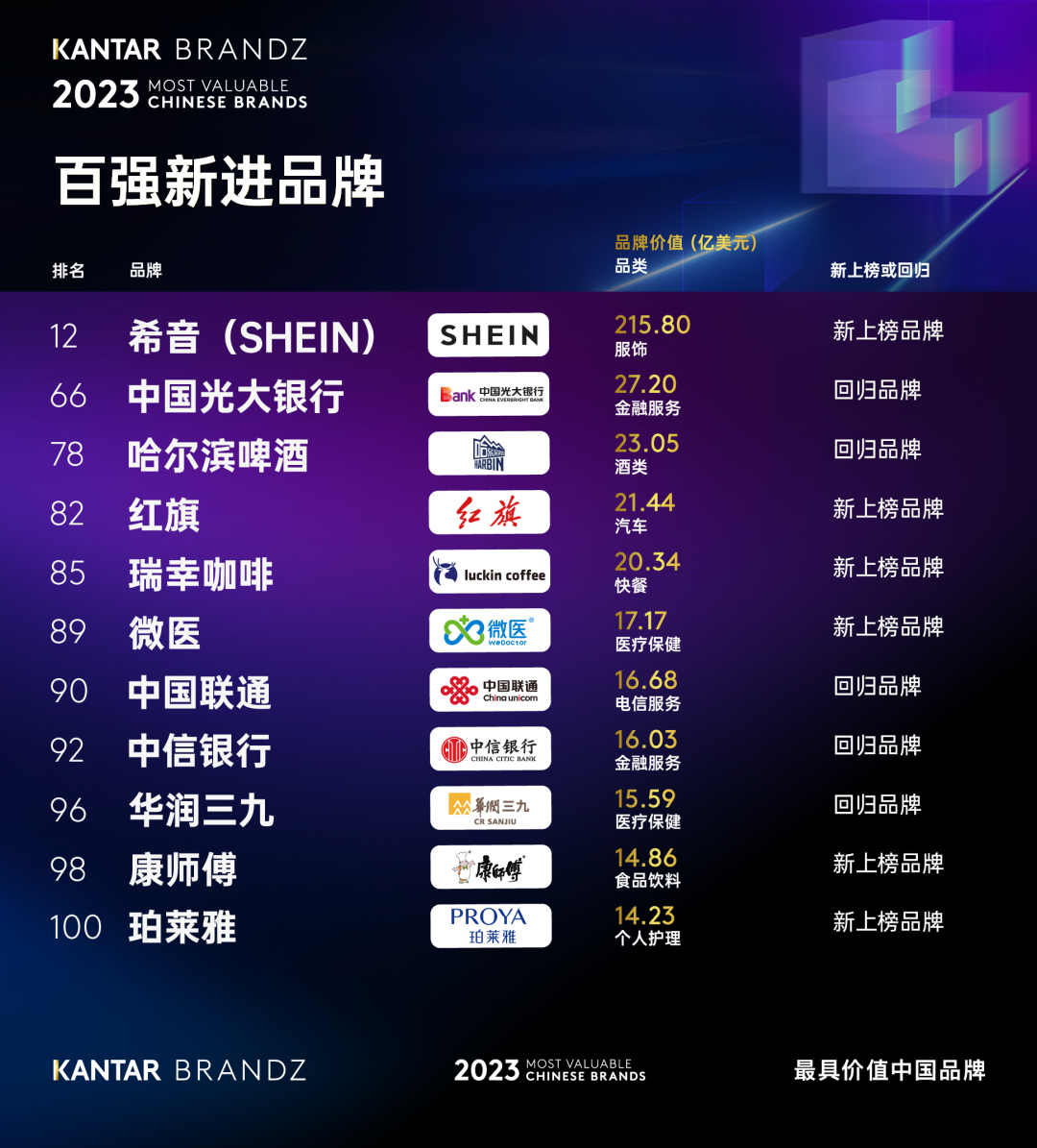 今年,凱度BrandZ中國百強榜單迎來了11新上榜或回歸品牌。這些品牌來自九個不同行業,足以證明“英雄莫問出處”。在今天的中國市場中,打造知名品牌仍然有許多途徑可供選擇。全球時尚品牌希音(SHEIN)(第12名,215.80億美元)是新躍升榜單中排名最靠前的品牌。