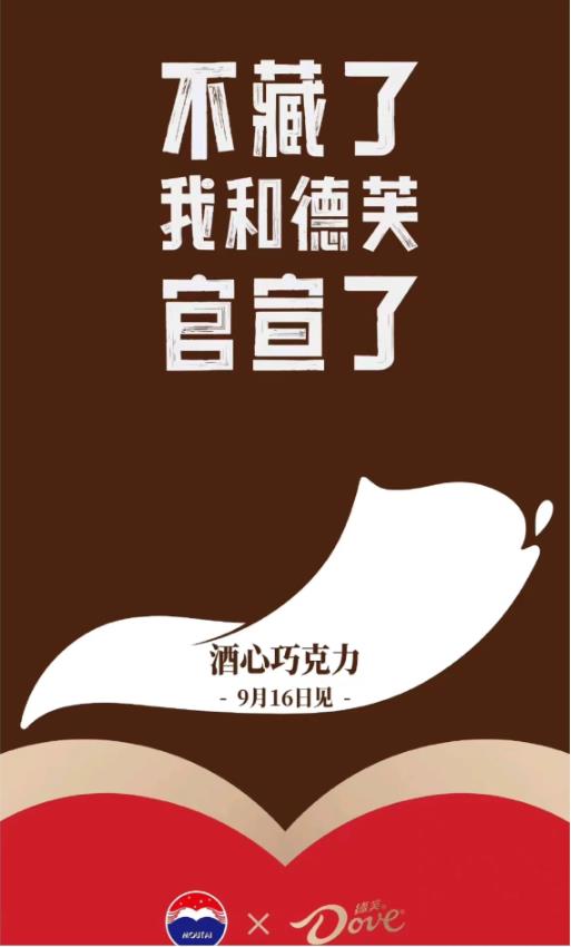 9月14日上午,貴州茅臺、德芙均在微博上發布官宣海報,并配文稱,酒心巧克力,9月16日見。