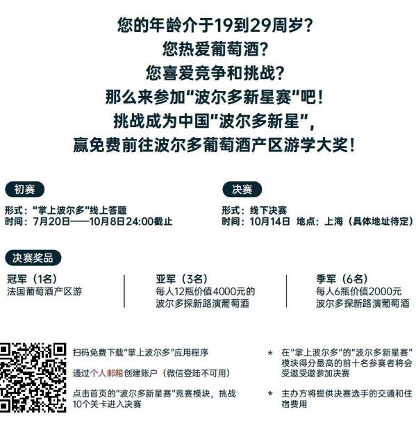 波爾多葡萄酒行業協會(CIVB)連續第三年在中國舉辦“波爾多新星賽”,初賽采用線上的方式,歡迎全國各地的葡萄酒青年,只要成年且年齡界于19-29歲,熱愛葡萄酒,就可以參與!