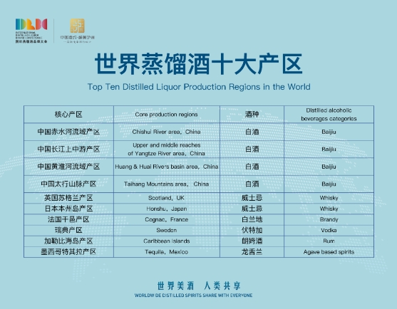 世界蒸餾酒十大產區包括,中國占據4席,包括:中國的赤水河流域產區(白酒)、長江上中游產區(白酒)、黃淮河流域產區(白酒)、太行山脈產區(白酒)、英國蘇格蘭產區(威士忌)、日本本州島產區(威士忌)、法國干邑產區(白蘭地)、瑞典產區(伏特加)、加勒比海島產區(朗姆酒)、墨西哥特其拉產區(龍舌蘭)。