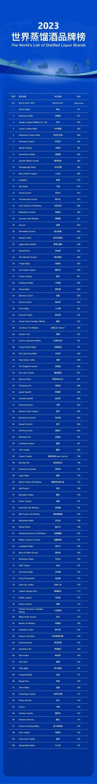 大會評選出100個世界蒸餾酒品牌,其中,中國27家酒企入選,分別為茅臺、五糧液、洋河、瀘州老窖、杏花村汾酒、劍南春、古井貢酒、郎酒、習酒、勁酒、迎駕貢、今世緣、西鳳酒、口子窖、沱牌舍得、水井坊、酒鬼、白云邊、老白干、牛欄山、天佑德、貴州珍酒、伊力特酒、紅星、金徽、金門高粱酒、江小白入選2023世界蒸餾酒品牌榜。