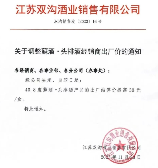 11月20日,江蘇雙溝酒業(yè)銷售有限公司發(fā)布通知 ,即日起,40.8度蘇酒·頭排酒產(chǎn)品的出廠結(jié)算價(jià)提價(jià)30元/盒。