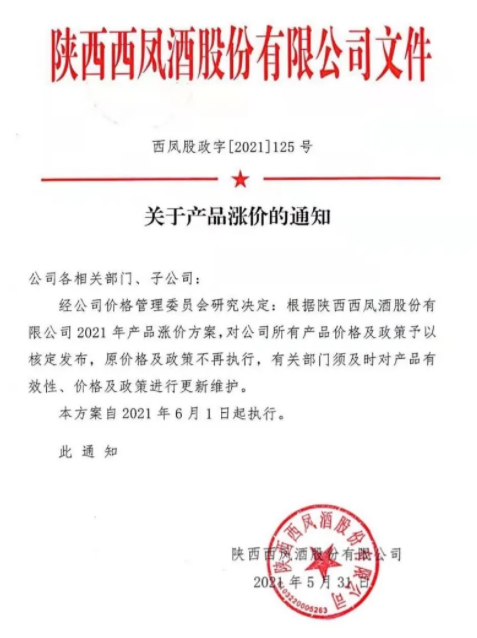 5月31日,陜西西鳳酒股份有限公司發布官方文件《關于產品漲價的通知》,自2021年6月1日起全系產品價格上調。