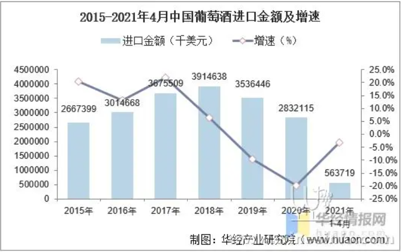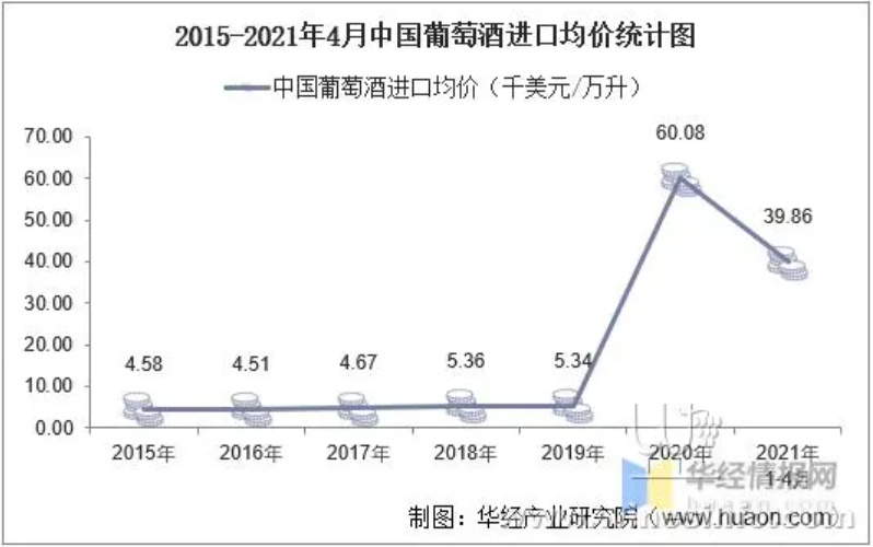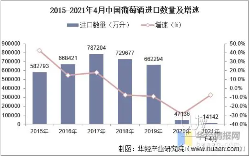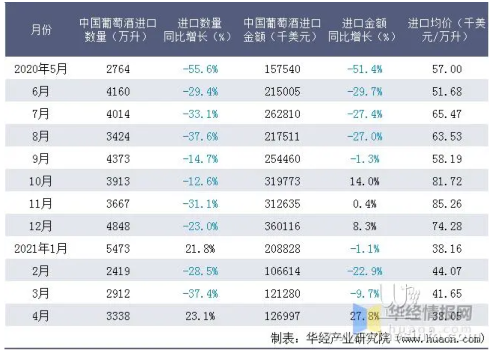 2021年1-4月中國葡萄酒進口數量為14142萬升,相比2020年同期減少了1848萬升,同比下降7.2%;進口金額為563719千美元,相比2020年同期減少了169398千美元,同比下降3.3%;2021年1-4月中國葡萄酒進口均價為39.86千美元/萬升。