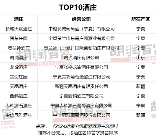 2024胡潤中國葡萄酒酒莊50強完整榜單: