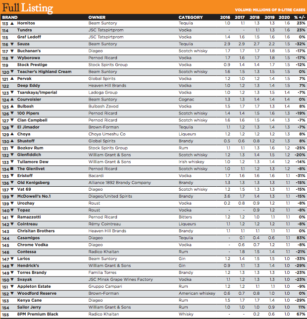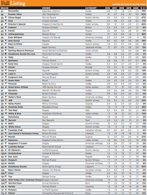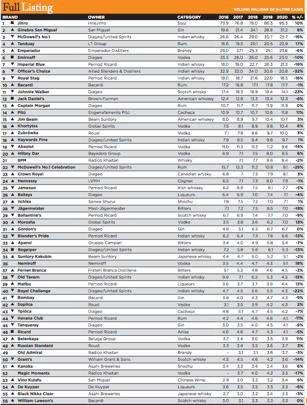 我們感謝和尊重每一位創(chuàng)作者的辛苦勞動和付出,本站部分內(nèi)容轉(zhuǎn)載自網(wǎng)絡(luò),轉(zhuǎn)載之目的在于分享、傳播、研究,而非商業(yè)用途,轉(zhuǎn)載文章只代表作者觀點,不代表本站立場。所有文章均已備注作者及來源,如侵犯您的權(quán)利,請及時聯(lián)系我們處理,非常感謝。供稿內(nèi)容由供稿單位組織或個人獨立承擔完全責(zé)任。酒展網(wǎng) » Drinks International發(fā)布世界烈酒銷量排名報告The Millionaires’ Club,2020年銷量比2019年減少8.5%,威士忌下降量最大