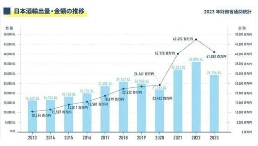 從具體數(shù)據(jù)來看,2023年日本清酒出口額為410.8億日元(按照當前匯率計為:約人民幣19.64億元),出口量為29196千升,同比去年分別下滑13%、19%,結束了出口額連續(xù)13年創(chuàng)下歷史新高的勢頭。