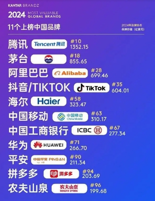 中國上榜的11個品牌是:騰訊、茅臺、阿里巴巴、抖音、海爾、中國移動、中國工商銀行、華為、平安、拼多多、農夫山泉。