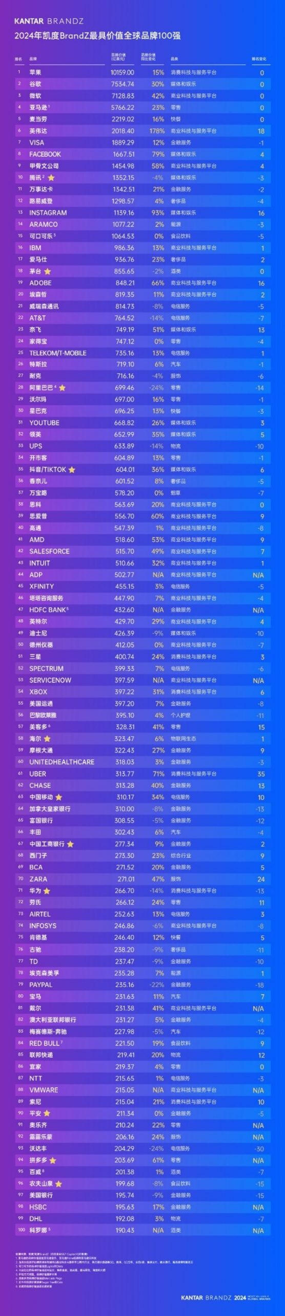 2024年凱度BrandZ最具價值全球品牌100強榜單完整榜單:
