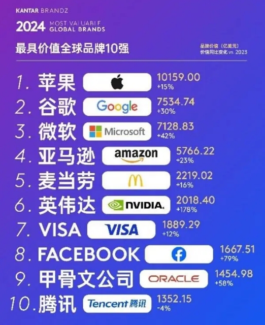 排名前十的品牌中,只有1家中國品牌,就是騰訊,排名第十。其他前九名的分別是:蘋果、谷歌、微軟、亞馬遜、麥當勞、英偉達、VISA、FACEBOOK、甲骨文。