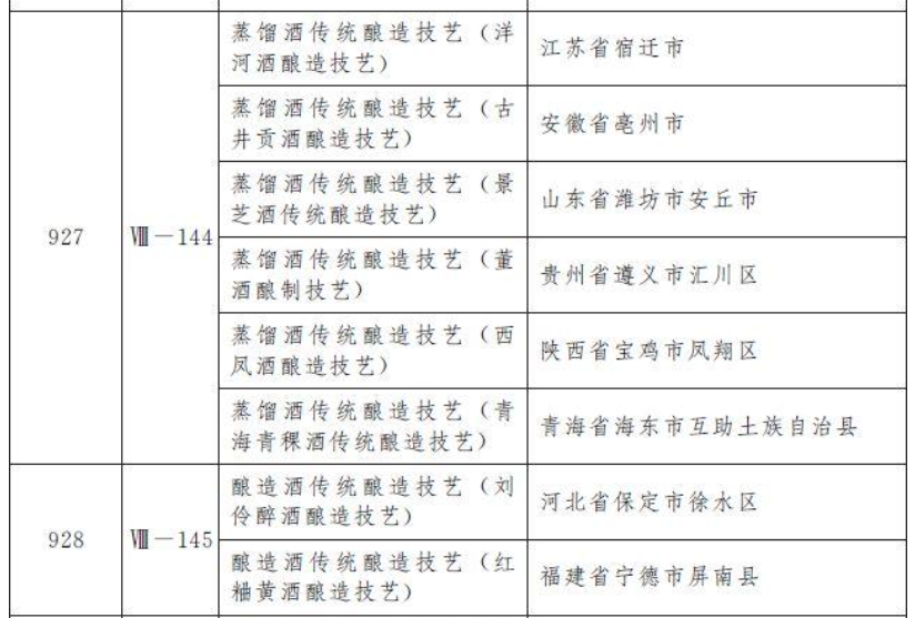 6月10日消息,近日,國務院發布通知稱,國務院批準文化和旅游部確定的第五批國家級非物質文化遺產代表性項目名錄(共計185項)和國家級非物質文化遺產代表性項目名錄擴展項目名錄(共計140項),現予公布。其中8種傳統的釀酒技藝入選,分別是:洋河酒釀造技藝、古井貢酒釀造技藝、景芝酒傳統釀造技藝、董酒釀造技藝、西鳳酒釀造技藝、青海青稞酒傳統釀造技藝、劉伶醉酒釀造技藝以及紅粬黃酒釀造技藝。