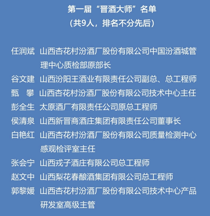 為了推動山西酒業產業健康持續發展,促進釀酒行業人才隊伍的建設,完善晉酒行業釀酒師、品酒師和白酒釀造工工種的職業序列,致敬中國大曲清香酒師,弘揚晉酒工匠精神,傳承酒師力量,助推我省酒業高質量發展,按照《晉酒大師評價實施辦法》,經晉酒大師評價委員會研究,現就第一屆“晉酒大師”和“特聘晉酒大師”名單進行公示,公示期為3個工作日,公示期間如有任何異議,請與晉酒大師評價委員會辦公室聯系,聯系電話(0351)7236799。