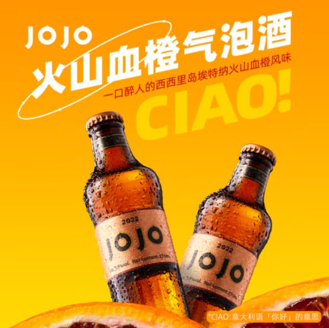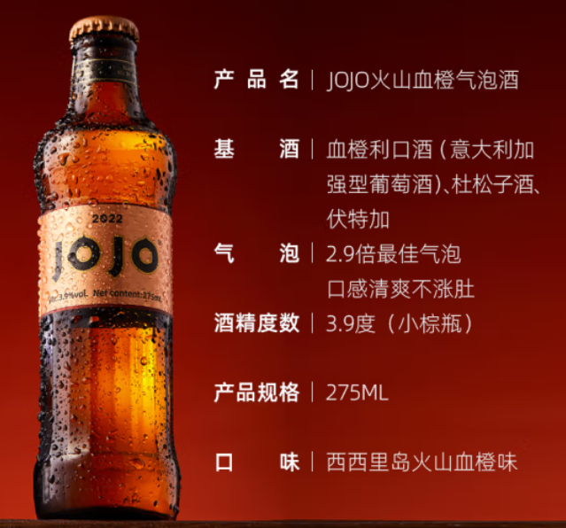 近日,JOJO氣泡酒發(fā)布消息,旗下新品JOJO火山血橙氣泡酒上市售賣。該產品基酒采用血橙利口酒(意大利加強型葡萄酒)、杜松子酒、伏特加,酒精度3.9%vol,容量275ml,具有西西里島火山血橙味,0嘌呤,0化學添加。